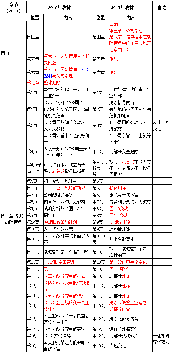 2017年《公司战略与风险管理》教材去去年相比有较多的变动,大体表现在以下几方面: